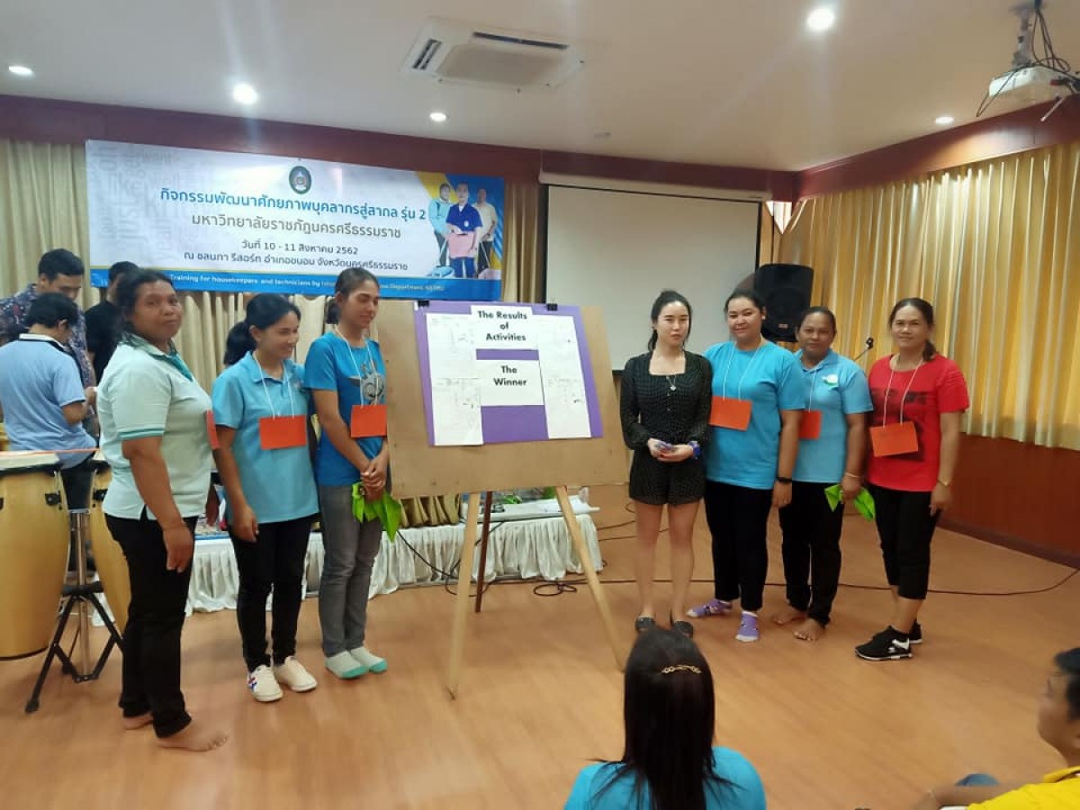 หน่วยวิเทศสัมพันธ์ มหาวิทยาลัยราชภัฏนครศรีธรรมราช จัดกิจกรรมพัฒนาศักยภาพบุคลากรสู่สากล รุ่น 2 เพื่อพัฒนาทักษะทางด้านภาษาอังกฤษให้กับพนักงานประจำตึก พนักงานพื้นที่ และช่างเทคนิคของมหาวิทยาลัยราชภัฏนครศรีธรรมราช เมื่อวันที่ 10-11 สิงหาคม 2562 ณ ชลนภา รีสอร์ท อำเภอขนอม จังหวัดนครศรีธรรมราช โดยมีวิทยากรชาวไทยและชาวต่างชาติจากศูนย์ภาษา และวิทยากรกิจกรรมสันทนาการจากคณะมนุษยศาสตร์และสังคมศาสตร์ มหาวิทยาลัยราชภัฏนครศรีธรรมราช มาร่วมถ่ายทอดความรู้ในครั้งนี้ด้วย กิจกรรมนี้มุ่งเน้นการพัฒนาทักษะภาษาอังกฤษขั้นพื้นฐานให้กับผู้เข้าร่วมกิจกรรมเพื่อให้สามารถสื่อสารกับชาวต่างชาติในมหาวิทยาลัย