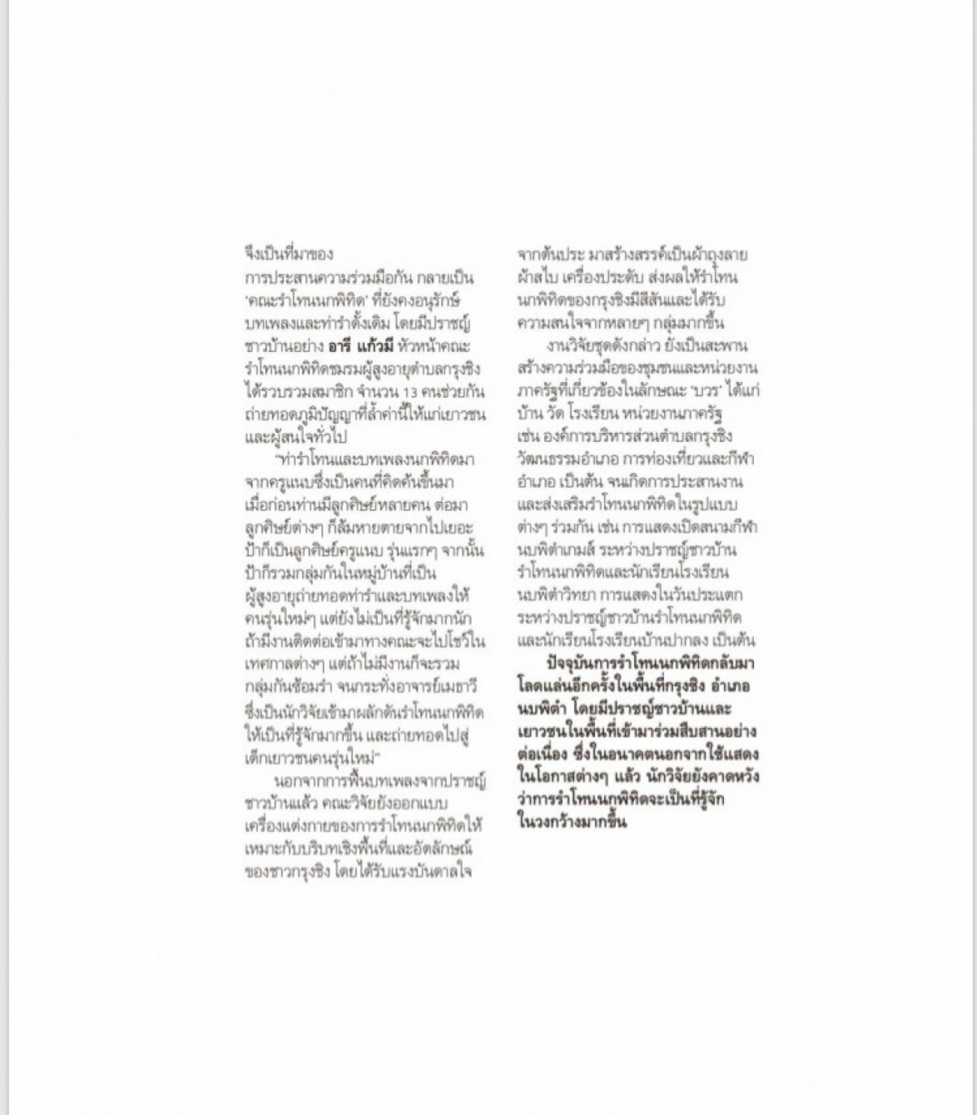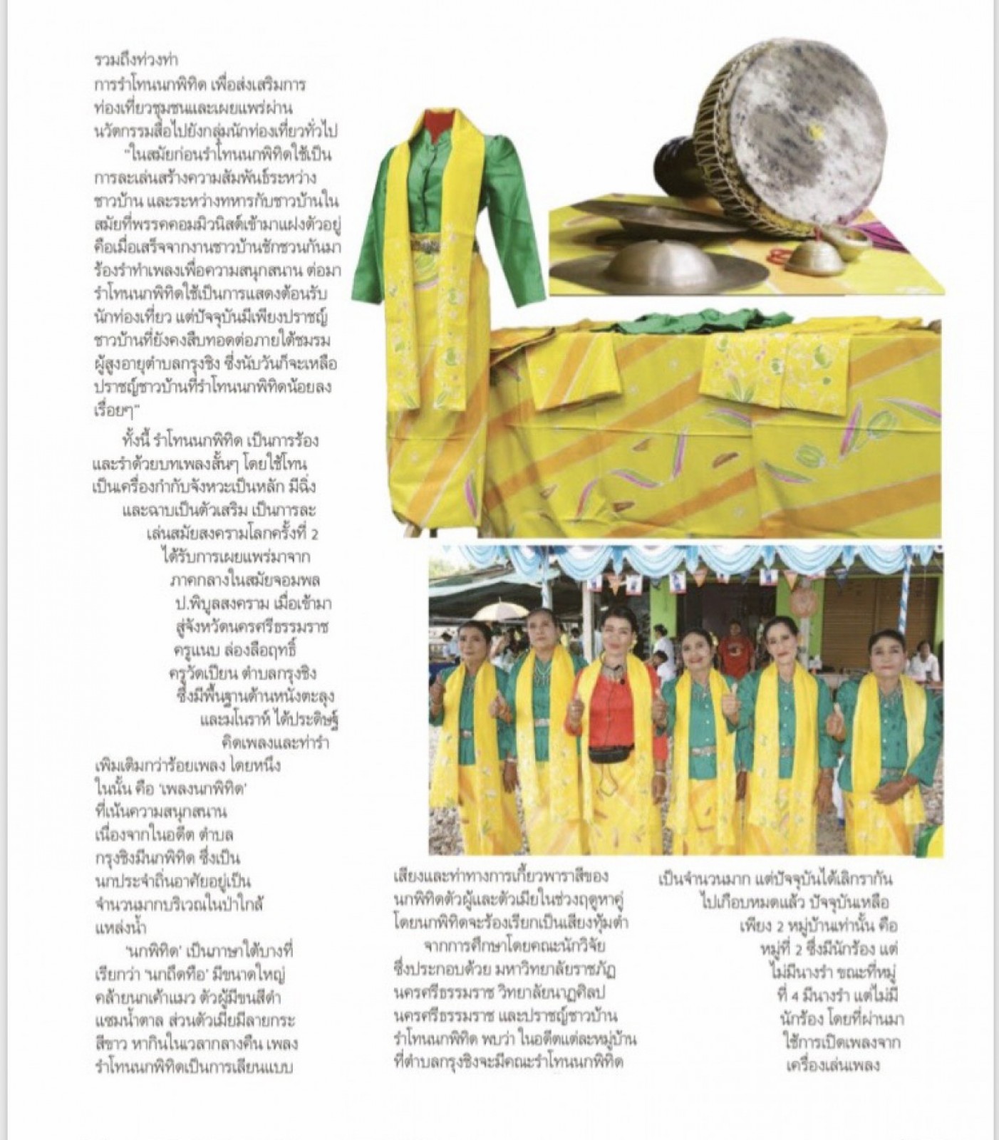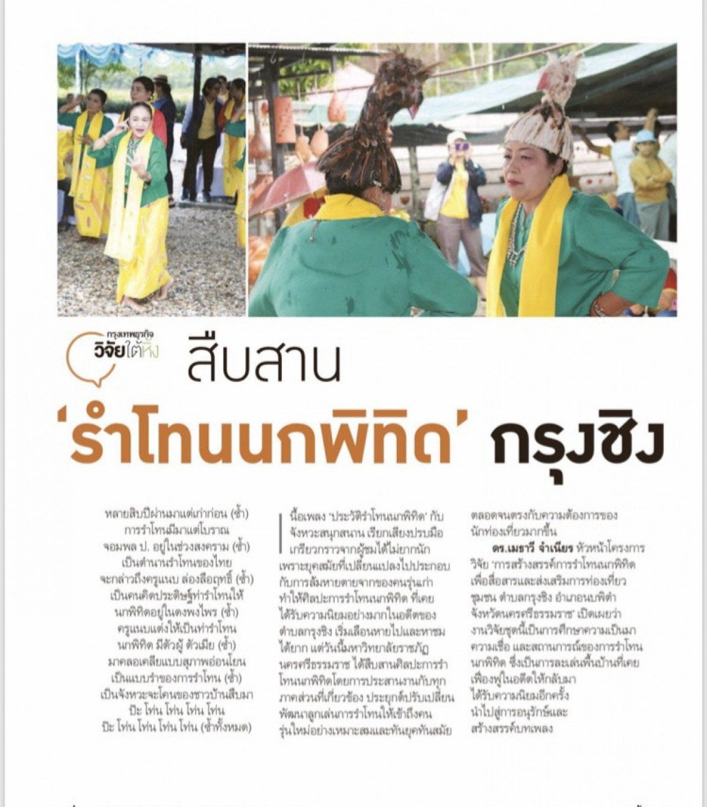 ‘รำโทนนกพิทิด’ กรุงชิง ผลงานวิจัยโครงการของ ดร.เมธาวี จำเนียร และคณะอาจารย์ประจำสาขานิเทศศาสตร์ คณะวิทยาการ ซึ่งเป็นผลงานวิจัยเพื่อชุมชนมหาวิทยาลัยราชภัฏนครศรีธรรมราช ภายใต้โครงการท้าทายไทย (ABC) ปีที่ 2 อำเภอนบพิตำ จังหวัดนครศรีธรรมราช