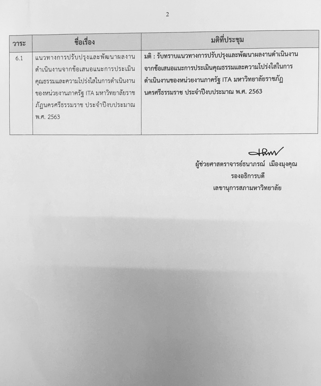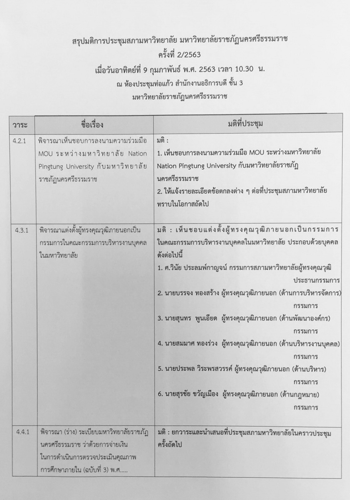 สรุปมติการประชุมสภามหาวิทยาลัย มหาวิทยาลัยราชภัฏนครศรีธรรมราช ครั้งที่ 2/2563