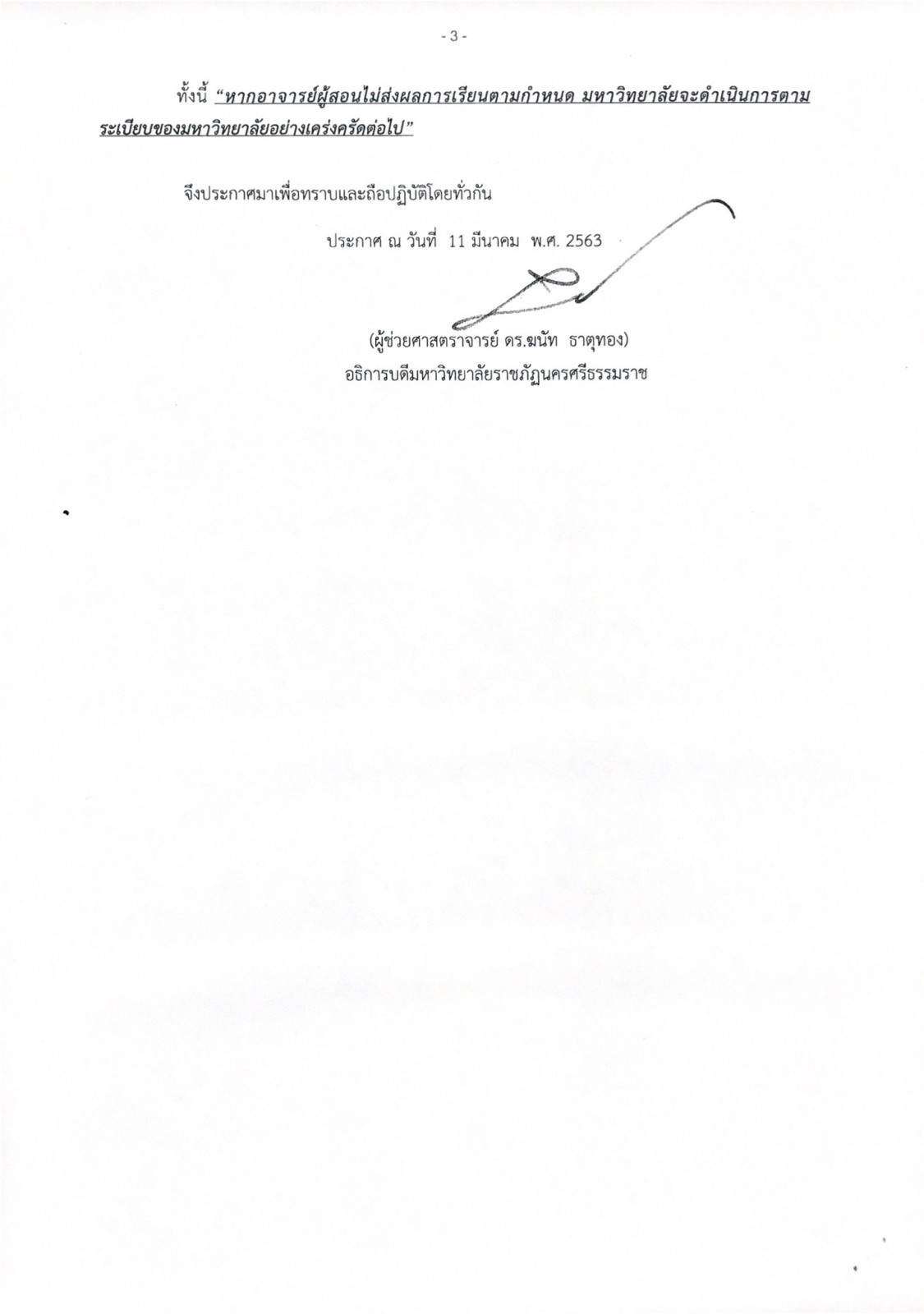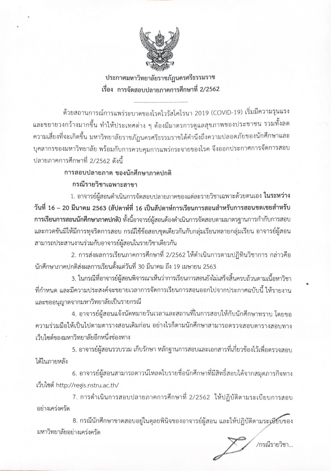 ประกาศมหาวิทยาลัยราชภัฏนครศรีธรรมราช เรื่อง การจัดสอบปลายภาคการศึกษาที่ 2/2562