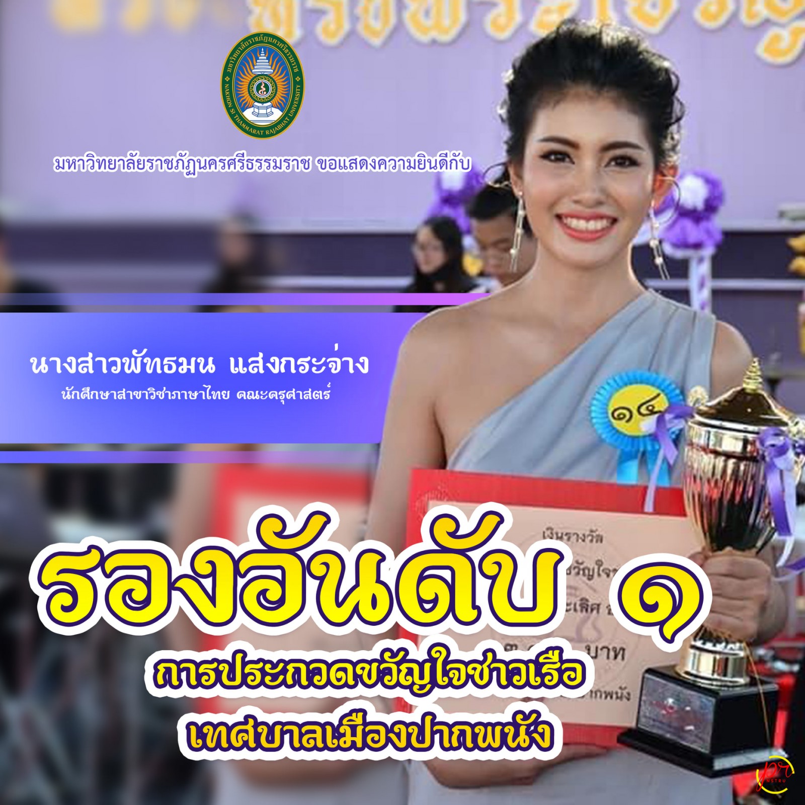 มหาวิทยาลัยราชภัฏนครศรีธรรมราช ขอแสดงความยินดีกับ นางสาวพัทธมน แสงกระจ่าง นักศึกษาสาขาวิชาภาษาไทย คณะครุศาสตร์ ที่ได้รับรองชนะเลิศอันดับ 1 การประกวดขวัญใจชาวเรือปากพนัง ในงานประเพณีลากพระแข่งเรือปากพนัง ประจำปี 2563