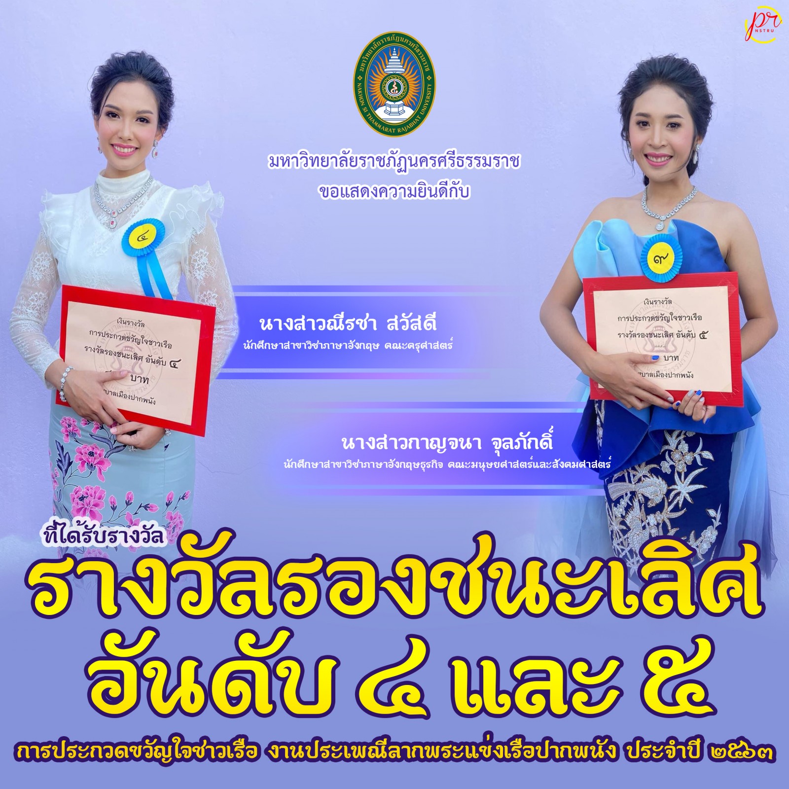 มหาวิทยาลัยราชภัฏนครศรีธรรมราช ขอแสดงความยินดีกับ นางสาวณีรชา สวัสดี นักศึกษาสาขาวิชาภาษาอังกฤษ คณะครุศาสตร์ ชั้นปีที่ 3 ได้รับรางวัลรองชนะเลิศอันดับ 4 และนางสาวกาญจนา จุลภักดิ์ นักศึกษาสาขาภาษาอังกฤษธุรกิจ คณะมนุษยศาสตร์และสังคมศาสตร์ ชั้นปีที่ 4 ได้รับรางวัลรองชนะเลิศอันดับ 5 ในการประกวดขวัญใจชาวเรือปากพนัง ในงานประเพณีลากพระแข่งเรือปากพนัง ประจำปี 2563