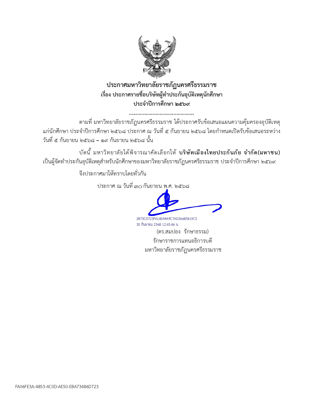 ประกาศรายชื่อบริษัทผู้ทำประกันอุบัติเหตุนักศึกษา ประจำปีการศึกษา 2569