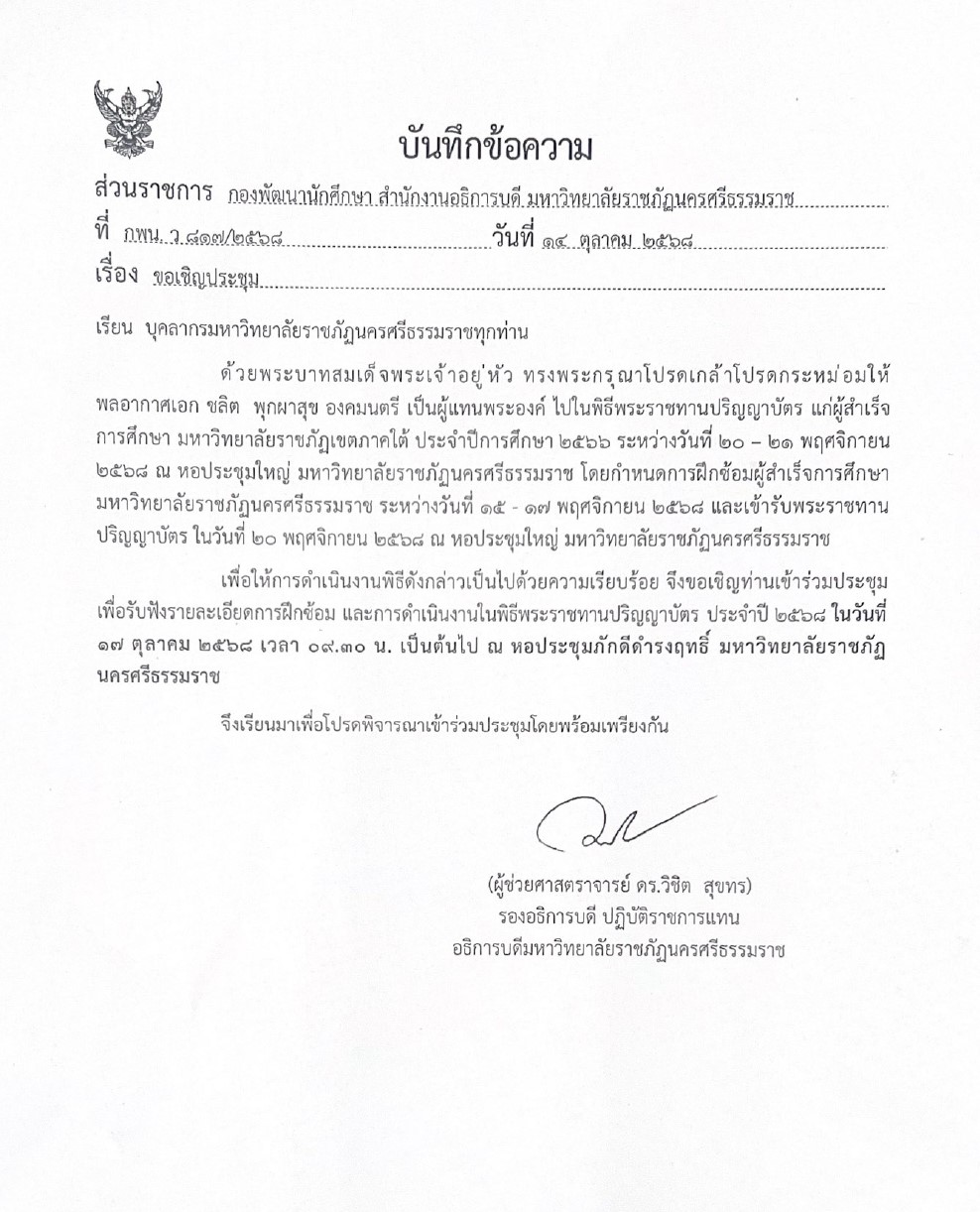 ขอเชิญบุคลากร ม.ราชภัฏนครศรีธรรมราชทุกท่าน ประชุมรับฟังรายละเอียดการฝึกซ้อมและการดำเนินงานพิธีพระราชทานปริญญาบัตรประจำปี 2568