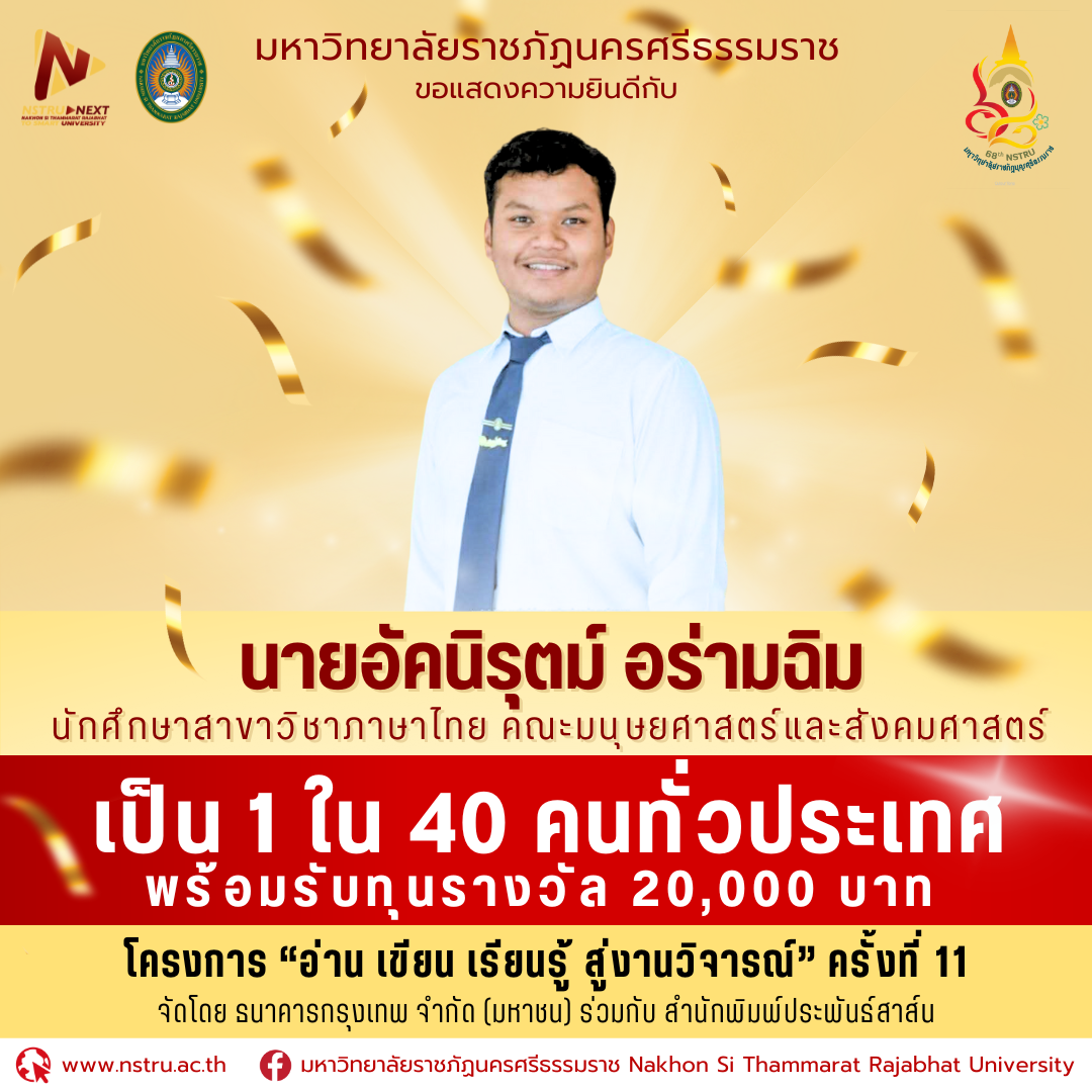 มหาวิทยาลัยราชภัฏนครศรีธรรมราช ขอแสดงความยินดีกับ นายอัคนิรุตม์ อร่ามฉิม นักศึกษาชั้นปีที่ 3 สาขาวิชาภาษาไทย คณะมนุษยศาสตร์และสังคมศาสตร์ ที่ได้รับคัดเลือกเป็น 1 ใน 40 คนทั่วประเทศ จากโครงการ “อ่าน เขียน เรียนรู้ สู่งานวิจารณ์” ครั้งที่ 11 จัดโดย ธนาคารกรุงเทพ จำกัด (มหาชน) ร่วมกับ สำนักพิมพ์ประพันธ์สาส์น โดยมี อาจารย์ศิวกร แรกรุ่น เป็นอาจารย์ที่ปรึกษา