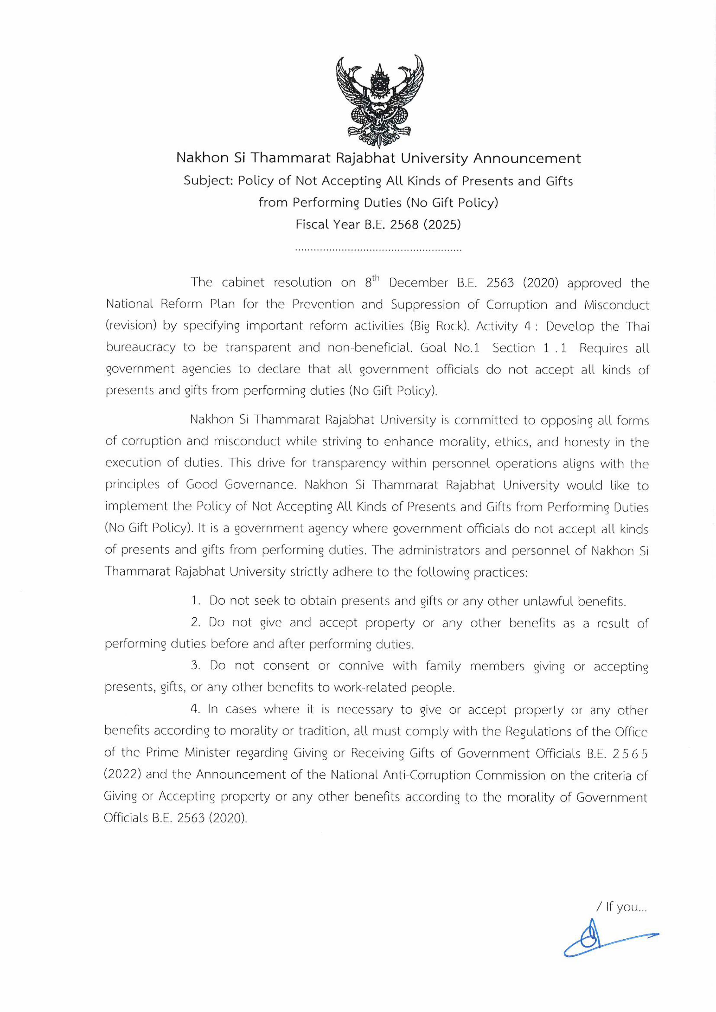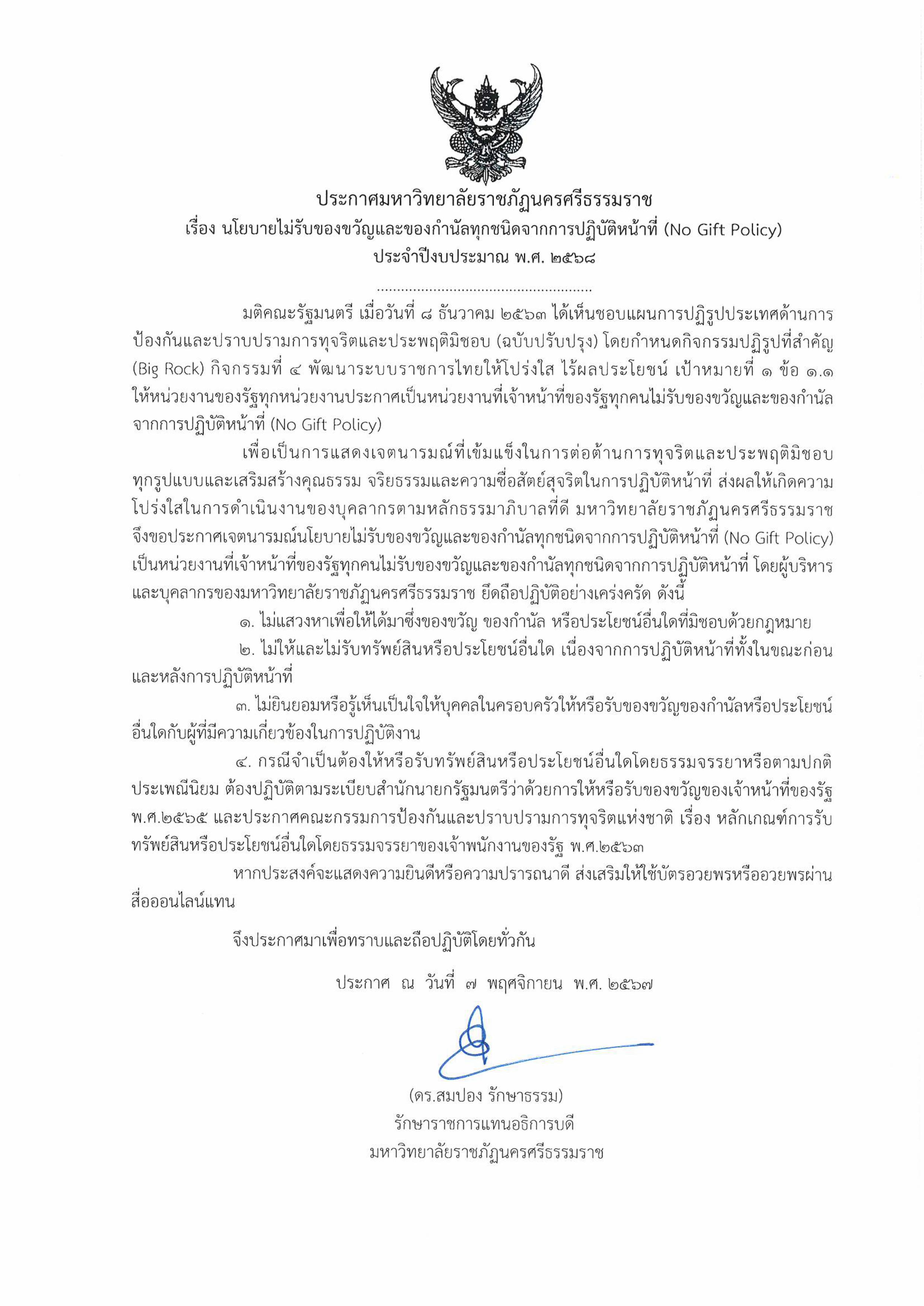 ประกาศนโยบายไม่รับของขวัญและของกำนัลทุกชนิดจากการปฏิบัติหน้าที่ (NO Gift Policy) ประจำปีงบประมาณ พ.ศ.2569