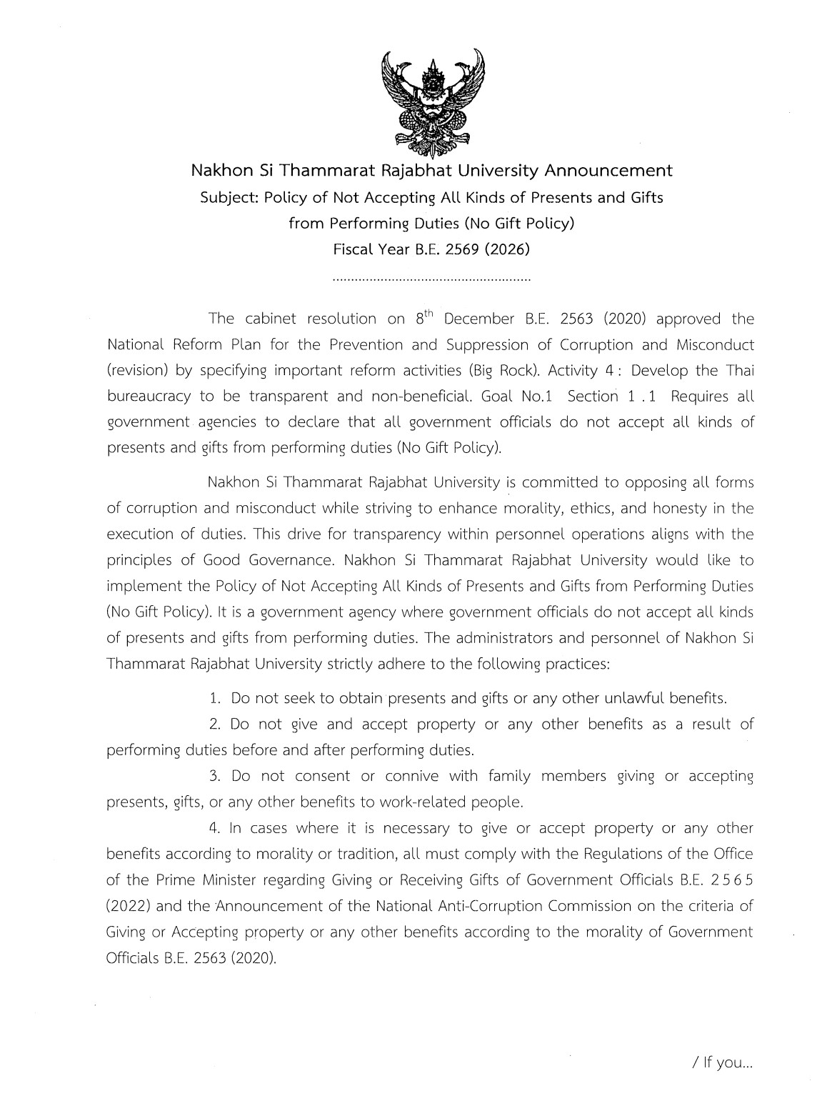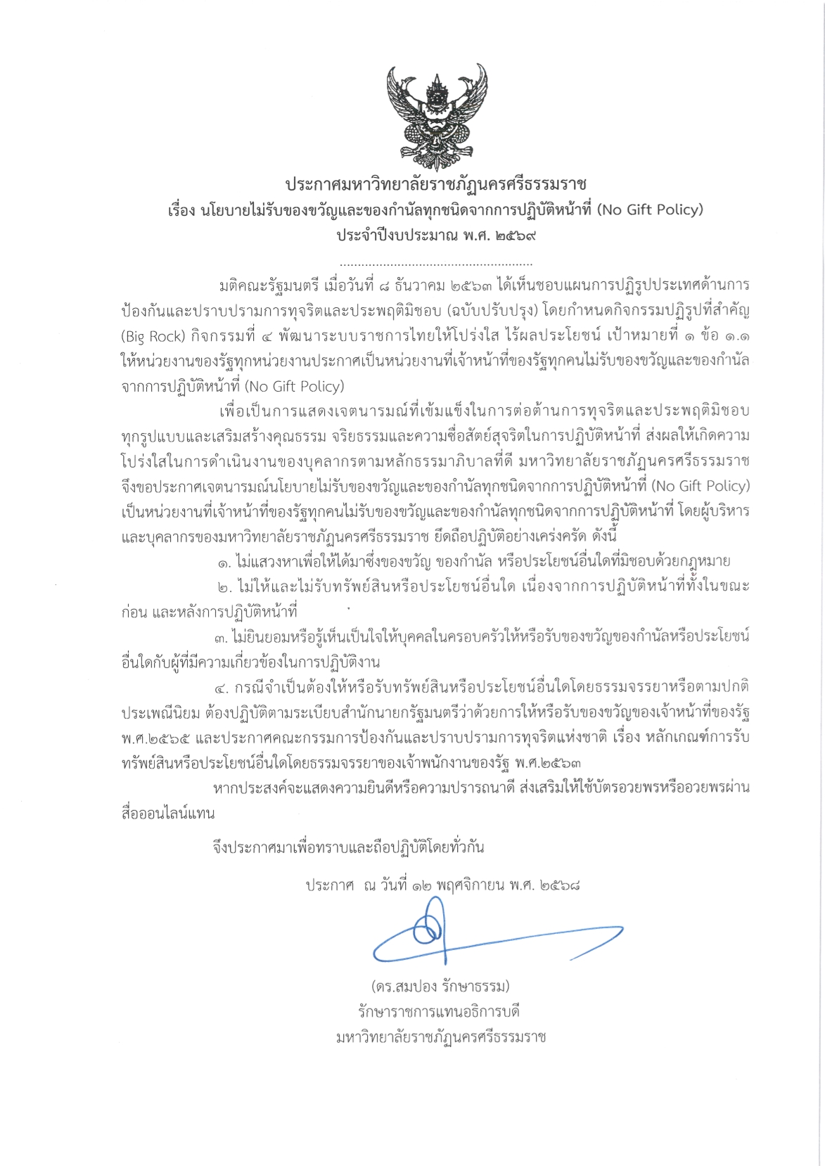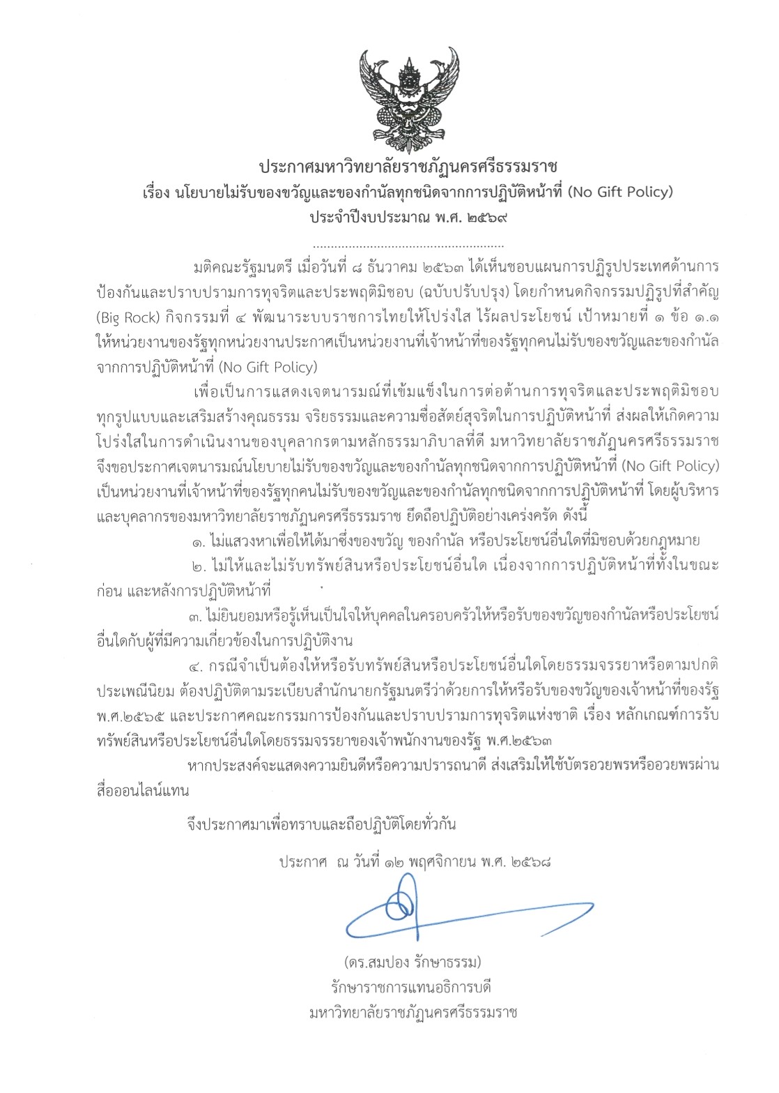 ประกาศนโยบายไม่รับของขวัญและของกำนัลทุกชนิดจากการปฏิบัติหน้าที่ (NO Gift Policy) ประจำปีงบประมาณ พ.ศ.2569