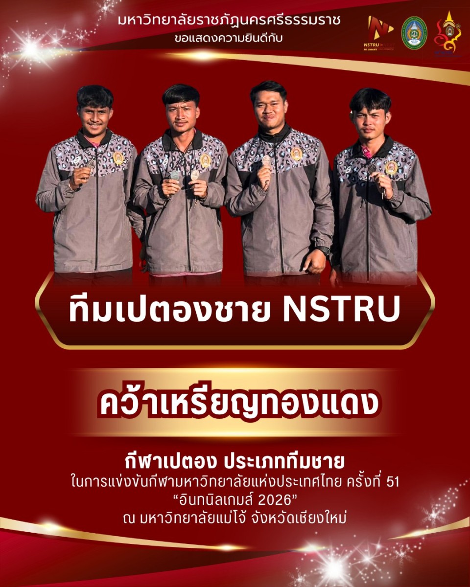 มหาวิทยาลัยราชภัฏนครศรีธรรมราช สร้างชื่อเสียงด้านกีฬาด้วยการคว้าเหรียญทองแดงเหรียญที่ 4 จากการแข่งขันกีฬาเปตอง ประเภททีมชาย ในการแข่งขันกีฬามหาวิทยาลัยแห่งประเทศไทย ครั้งที่ 51 อินทนิลเกมส์ Inthanin Games 2026 ซึ่งจัดขึ้นเพื่อส่งเสริมการพัฒนาศักยภาพด้านกีฬาและสร้างเสริมสุขภาพของนักศึกษา การแข่งขันในครั้งนี้ นักกีฬาของมหาวิทยาลัยราชภัฏนครศรีธรรมราชได้แสดงให้เห็นถึงความสามารถ ความมุ่งมั่น และน้ำใจนักกีฬา สามารถฝ่าฟันการแข่งขันกับสถาบันอุดมศึกษาจากทั่วประเทศ จนประสบความสำเร็จคว้าเหรียญทองแดงมาครอง สะท้อนถึงการฝึกซ้อมอย่างมีระบบ การทำงานเป็นทีม และการสนับสนุนด้านกีฬาจากมหาวิทยาลัยอย่างต่อเนื่อง