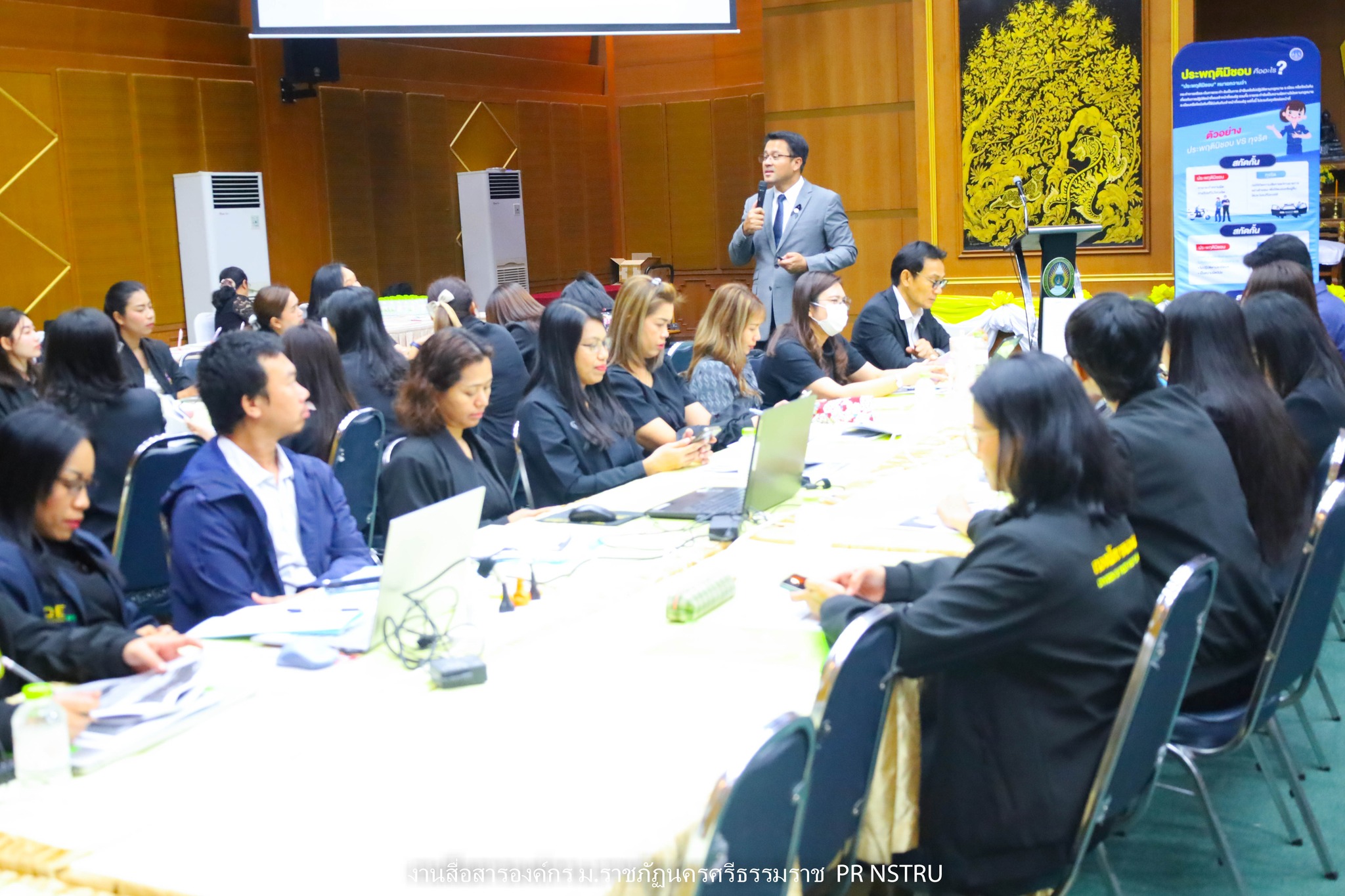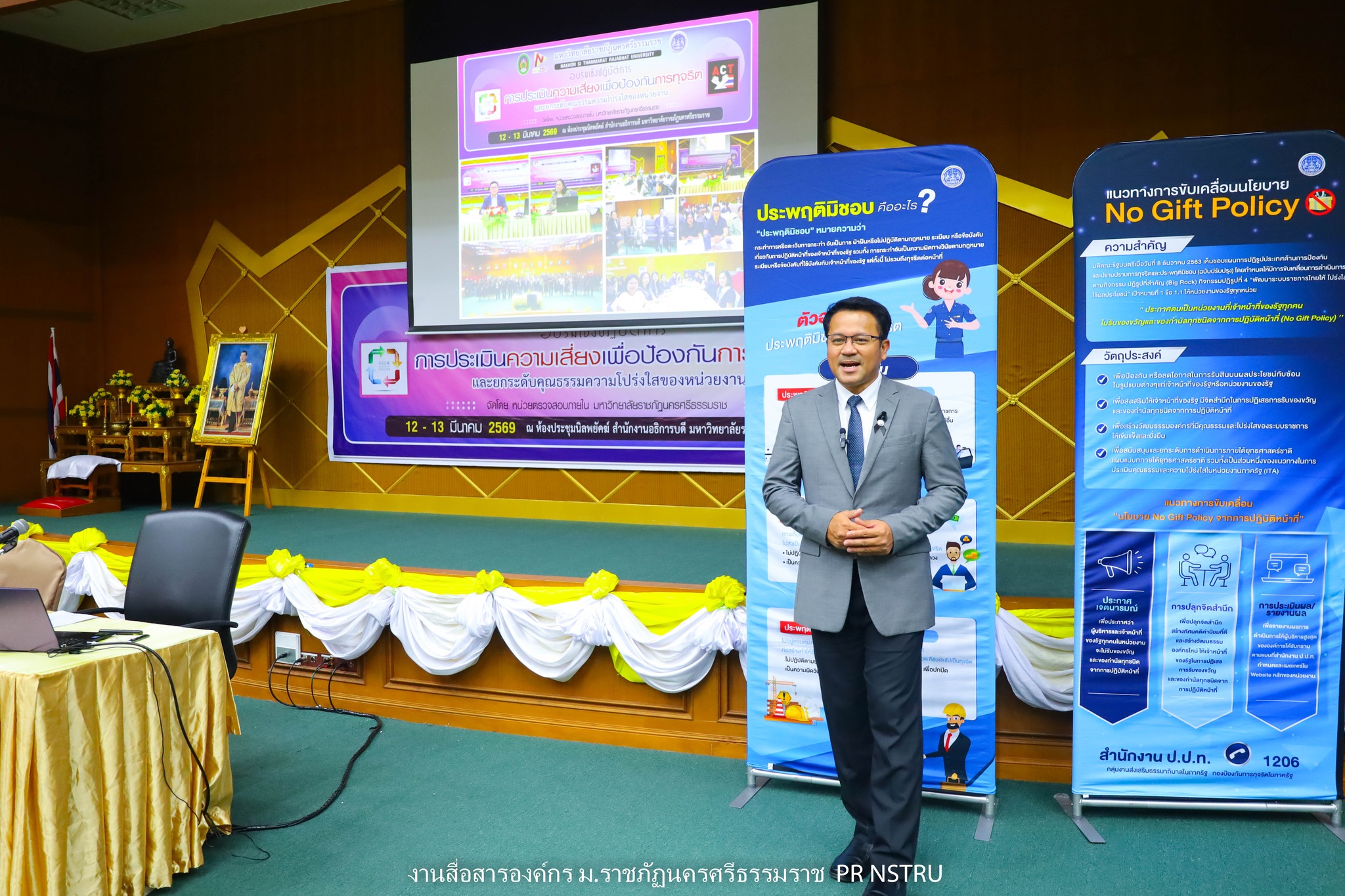 ทั้งนี้ มหาวิทยาลัยราชภัฏนครศรีธรรมราชได้ให้ความสำคัญกับการขับเคลื่อนนโยบายไม่รับของขวัญและของกำนัลทุกชนิดจากการปฏิบัติหน้าที่ (No Gift Policy) ประจำปีงบประมาณ พ.ศ. 2569 โดยมุ่งเน้นการปลูกจิตสำนึกและสร้างค่านิยมในการปฏิบัติงานของบุคลากรให้ยึดมั่นในความซื่อสัตย์สุจริต มีจริยธรรม และยึดถือประโยชน์ส่วนรวมเป็นสำคัญ อันเป็นการป้องกันการทุจริตและประพฤติมิชอบในหน่วยงานของรัฐ รวมทั้งเป็นการเสริมสร้างวัฒนธรรมองค์กรที่โปร่งใส ตรวจสอบได้ การจัดประชุมสัมมนาในครั้งนี้ยังเป็นเวทีในการแลกเปลี่ยนความคิดเห็น สร้างความตระหนักรู้ และเสริมสร้างความเข้าใจร่วมกันของบุคลากรภายในมหาวิทยาลัยเกี่ยวกับแนวทางการปฏิบัติที่เหมาะสมตามนโยบาย No Gift Policy ตลอดจนแนวทางการปฏิบัติตนตามหลักธรรมจรรยาของเจ้าพนักงานของรัฐ เพื่อให้การดำเนินงานของมหาวิทยาลัยเป็นไปด้วยความโปร่งใส มีประสิทธิภาพ และเกิดประโยชน์สูงสุดต่อองค์กรและสังคมโดยรวม การดำเนินกิจกรรมดังกล่าวถือเป็นกลไกสำคัญในการยกระดับมาตรฐานการบริหารจัดการภาครัฐของมหาวิทยาลัยให้สอดคล้องกับหลักธรรมาภิบาล และสนับสนุนการประเมินคุณธรรมและความโปร่งใสในการดำเนินงานของหน่วยงานภาครัฐ (Integrity and Transparency Assessment : ITA) ซึ่งจะช่วยเสริมสร้างความเชื่อมั่นให้แก่สังคมและผู้มีส่วนได้ส่วนเสียต่อการบริหารงานของมหาวิทยาลัยในระยะยาว